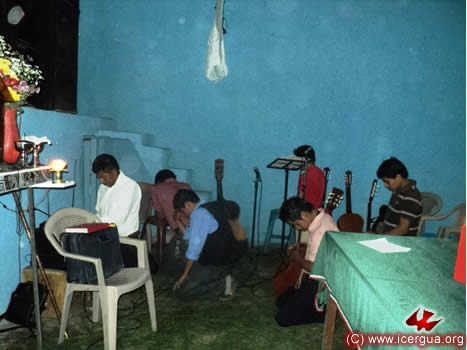 El sábado 12 por la noche, el obispo visitó la Comunidad Pacto Divino. Hace algunos meses, diversas situaciones contextuales habían provocado que ésta se quedara sin ministerio musical. El esfuerzo que han hecho entro todos los hermanos, ha permitido que actualmente cuenten ya con un ministerio bien organizado que está creciendo sensiblemente en su capacidad musical. A la izquierda se observa a los miembros del ministerio musical, mientras entonan el canto de entrada para la celebración de la Misa. |