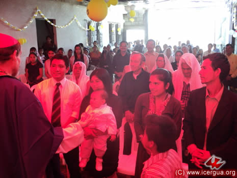 A la derecha: el obispo, despues de realizar el bautismo de unos de los niños, lo entrega a sus padres diciéndoles: "Reciban a Juan, que ahora ha sido constituido en hijo de Dios y miembro de su iglesia". |