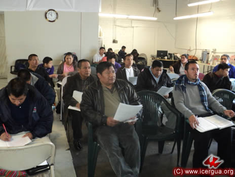Arriba: el Hermano Marcos de San Miguel Acatán, mientas expone la situación de las comunidades de ese municipio.