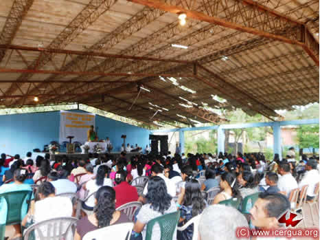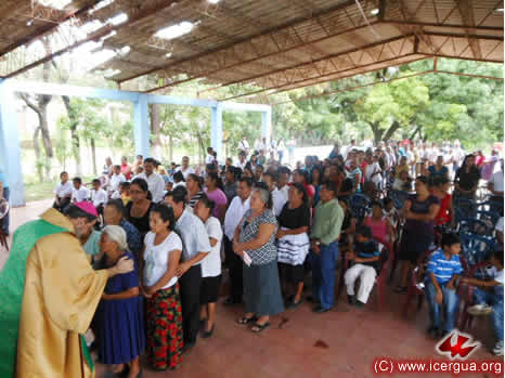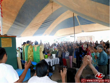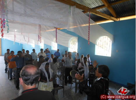 Los hermanos estaban llenos de alegría, porque después de varios años de esfuerzos, han logrado levantar las paredes y colocar el techo de su nuevo templo. Aún les falta terminar la construcción pero, por el momento, ya tienen el espacio adecuado para poder celebrar la Eucaristía y para que la comunidad se reun a orar. |