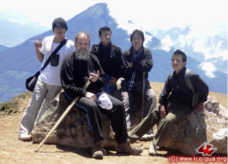 A la derecha: el obispo y el Padre Juan Moisés cuando se acercan a la cima del volcán.