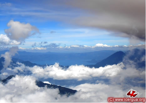 Una hermosa vista del lago de Atitlán y de los volcanes que le rodean, desde la cima del Volcán Santo Tomás. En primer plano, la nube provocada por la erupción del volcán de Fuego. |