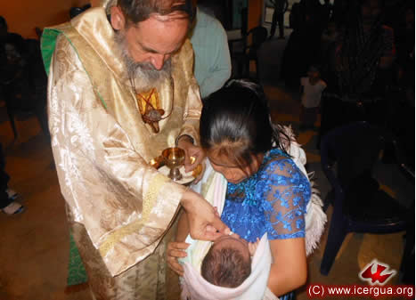 A la izquierda: momento del bautismo de uno de los niños que fue iniciado a la vida cristiana. |