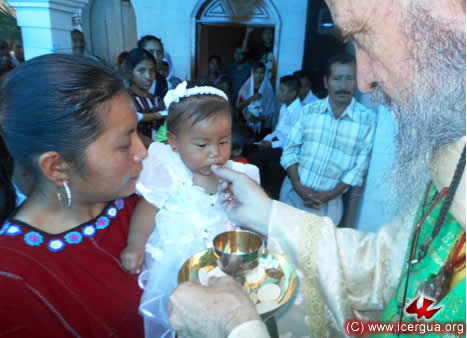 Luego, después de administrar la comunión a quien había sido iniciado en la vida cristiana, comulgaron sus padres, padrinos y centenares de fieles. |