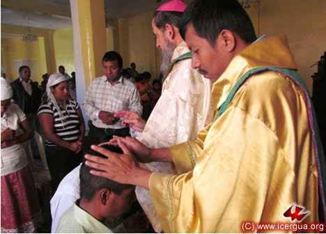 Todos los hermanos oraron devotamente implorando la efusión del Espíritu Santo, mientras el obispo hacía la unción con el Santo Crisma. |