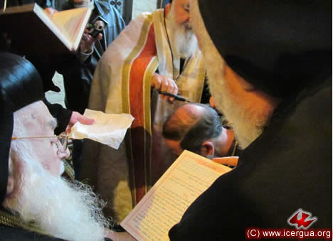 Seguidamente Mor George Saliba, Secretario del Santo Sínodo, procedió a cortar el pelo del obispo en cuatro puntos, en forma de cruz, como señal del despojo al mundo y a sus glorias. |