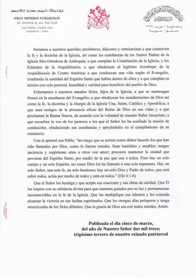 -"Instamos a nuestros queridos presbíteros, diáconos y seminaristas a que conserven la fe y la doctrina de la Iglesia, así como las enseñanzas de los Santos Padres de la Iglesia Siro-Ortodoxa de Antioquía; a que cumplan la Constitución de la Iglesia, y los Estatutos de la Arquidiócesis; a que obedezcan al legítimo Arzobispo de la Arquidiócesis de Centro América; a que conduzcan una vida según el Evangelio, irradiando la santidad del Espíritu Santo que habita dentro de ellos y a que cumplan su misión con celo pastoral, humildad y caridad para beneficio del pueblo de Dios."