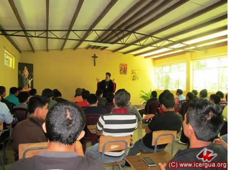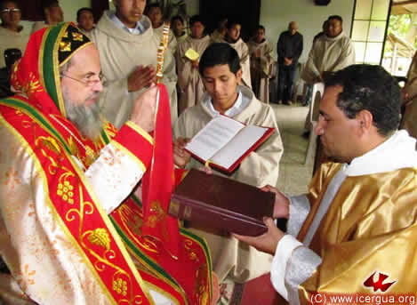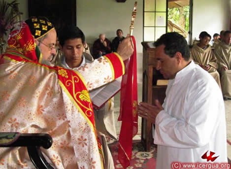 A la derecha el hermano Martín. Profesor de Química, de la Universidad Nacional Autónoma de Nicaragua, ha sentido la vocación para las órdenes sagradas desde hace muchos años. Ahora él fue admitido como candidato a las órdenes sagradas, asumiendo el compromiso de organizar una capellanía para la atención a los estudiantes y otras comunidades, así como de proseguir su formación teológica. |