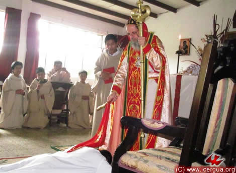 Después de que el candidato expresó su disponibilidad a incorporarse en forma perpetua a la Comunión Santa María del Nuevo Éxodo e hizo la opción de observar el celibato por el Reino de los Cielos, se tuvo el canto de las letanías de los santos, mientras él permanecía postrado y el Arzobispo oraba para que el Señor le llenara con su Santo Espíritu. |