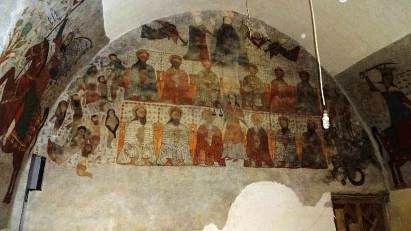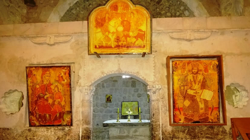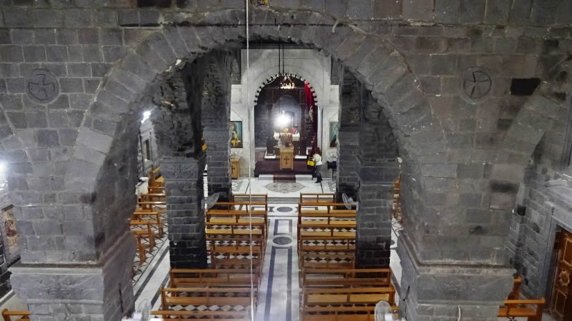 Se visitó la Iglesia más antigua, levantada sobre los vestigios de un templo pagano. La parte más antigua data del siglo III, aunque se le fueron añadiendo diversas partes posteriormente. Está dedicada a San Jorge. Está decorada con una serie de frescos que reflejan las técnicas de pintura que se utilizaron hace algunos siglos entre los cristianos de Siria. (fotos 5-7)