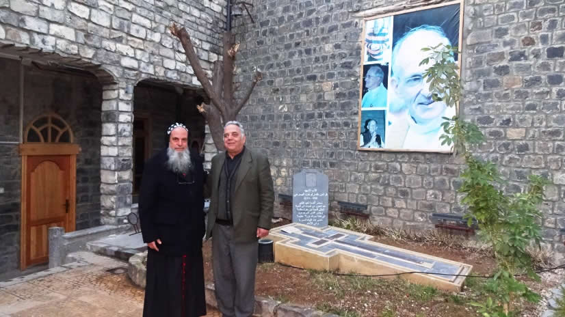 A pocos metros de la catedral, se encuentra un colegio y una misión de los jesuitas. Durante la ocupación de los terroristas, fue masacrado un misionero jesuita, el Padre Franz, que había pasado más de 40 años en Siria y era respetado y amado por todos. Se le considera mártir. En la foto 8, Mor Santiago Eduardo en el lugar del martirio y de la tumba, junto al Padre Miguel Daruf, jesuita, superior de la casa.