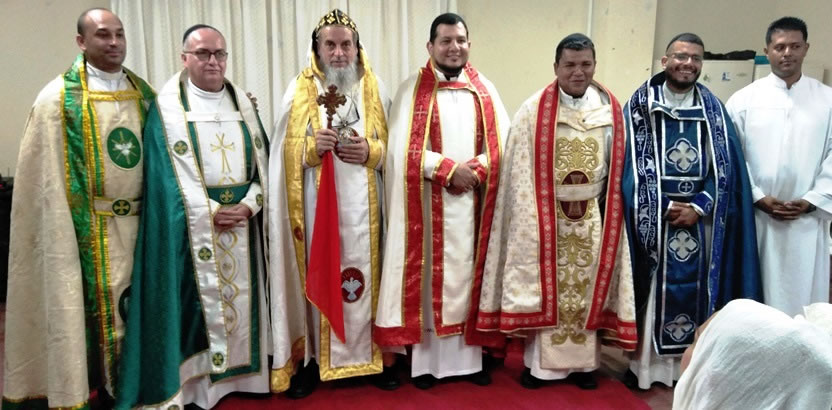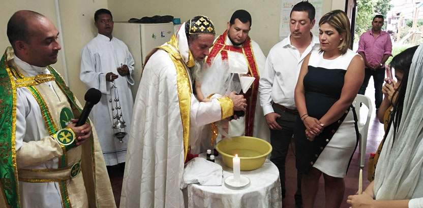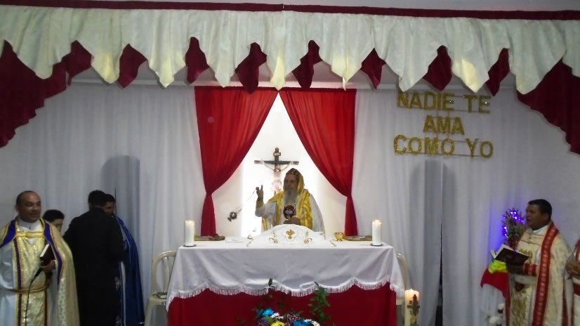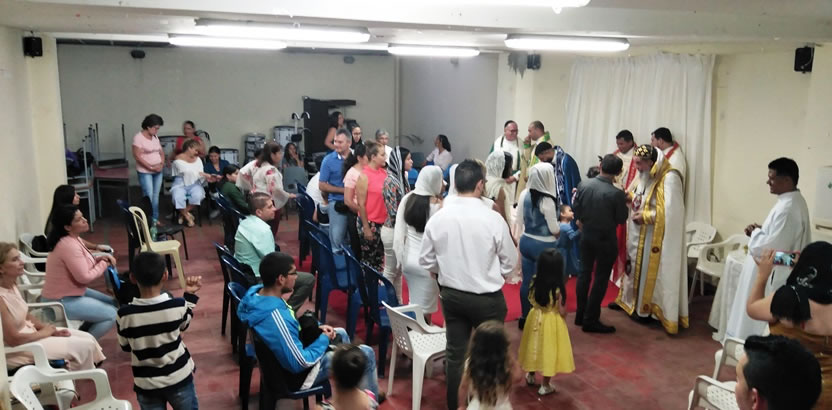 El padre Germán, junto a más de 200 fieles, se reunieron para recibir al arzobispo y para la celebración de la Divina Liturgia, en un salón, debido a que la parroquia aún no cuenta con instalaciones propias.