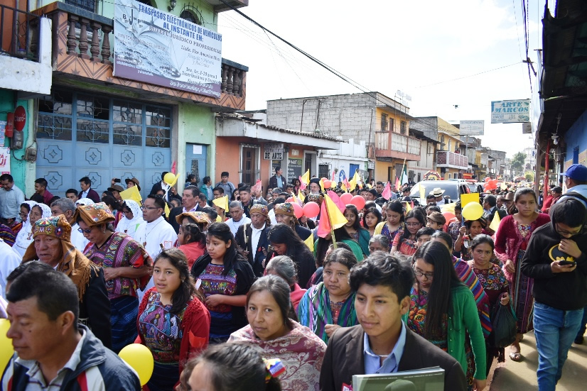 Al llegar a San Juan Comalapa, miles de fieles habían inundado la calle principal de entrada a la población, para dar la bienvenida a Su Santidad.