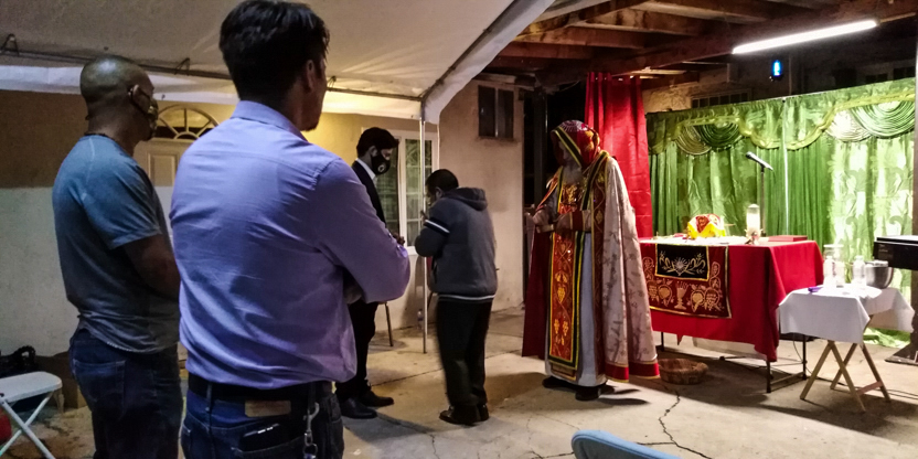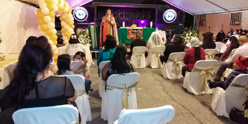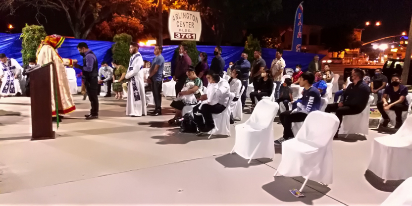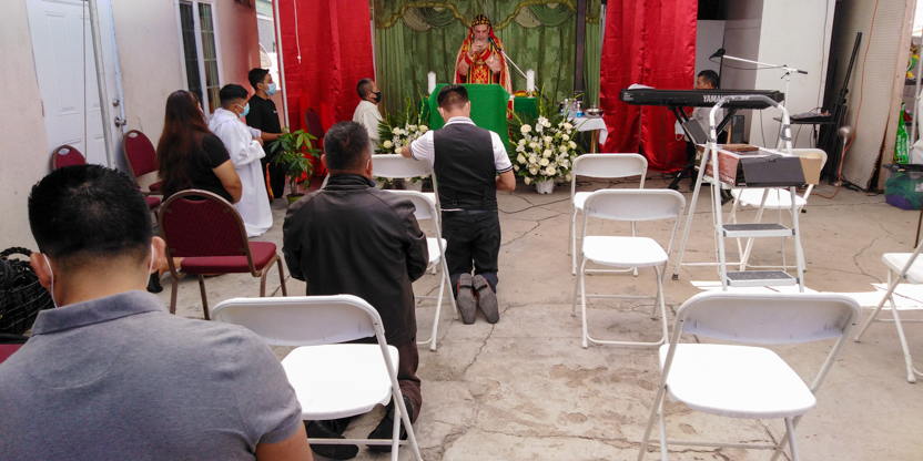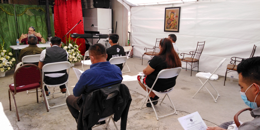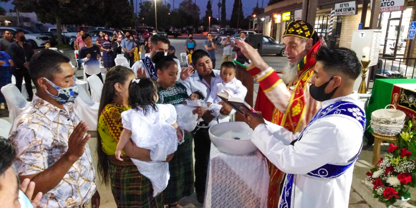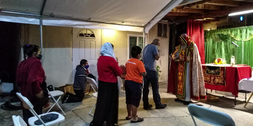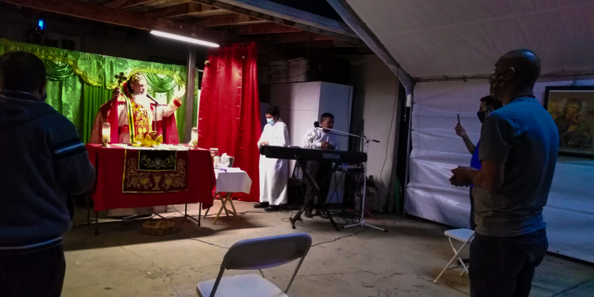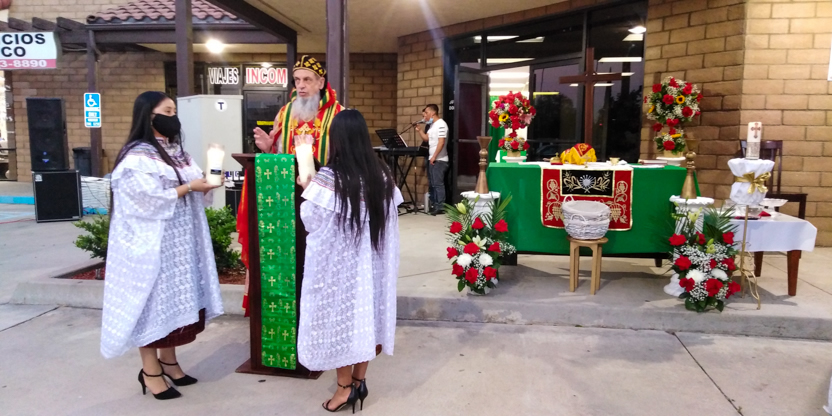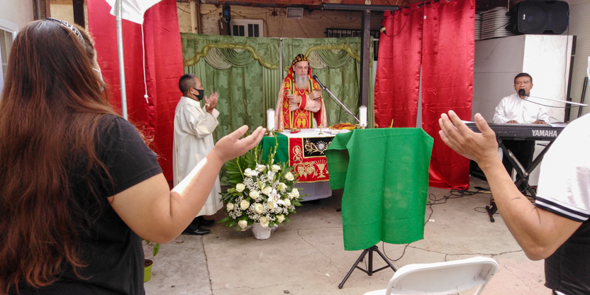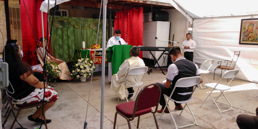 De acuerdo a las normas sanitarias que están en vigencia en el Condado de Los Ángeles, la celebración de la liturgia tuvo lugar en un área abierta, adyacente al templo.