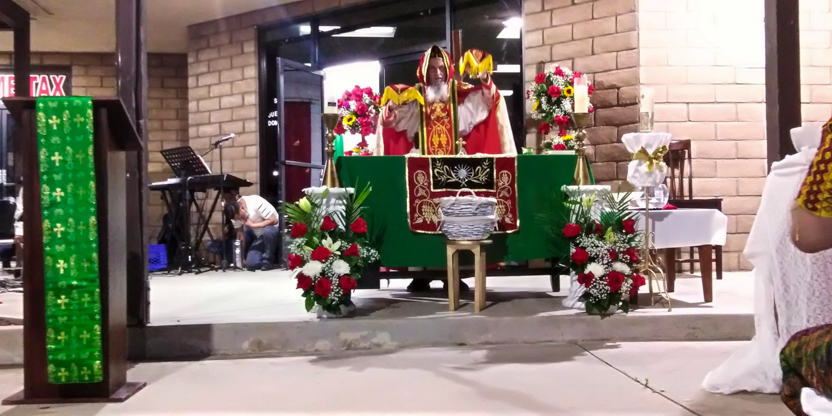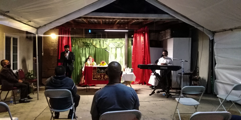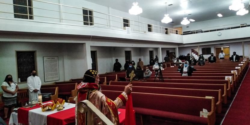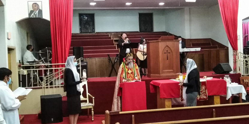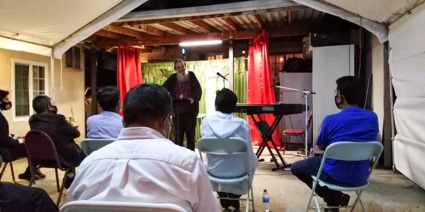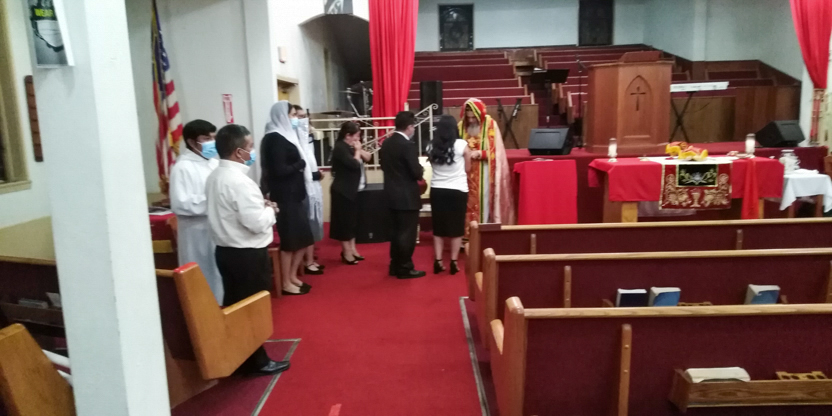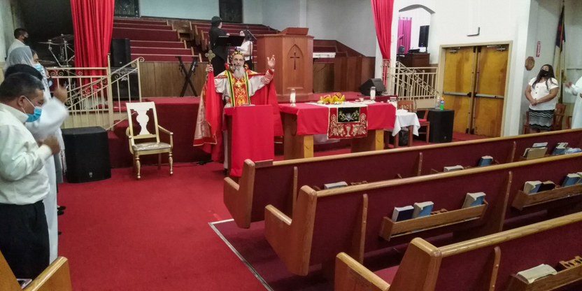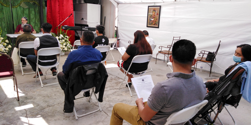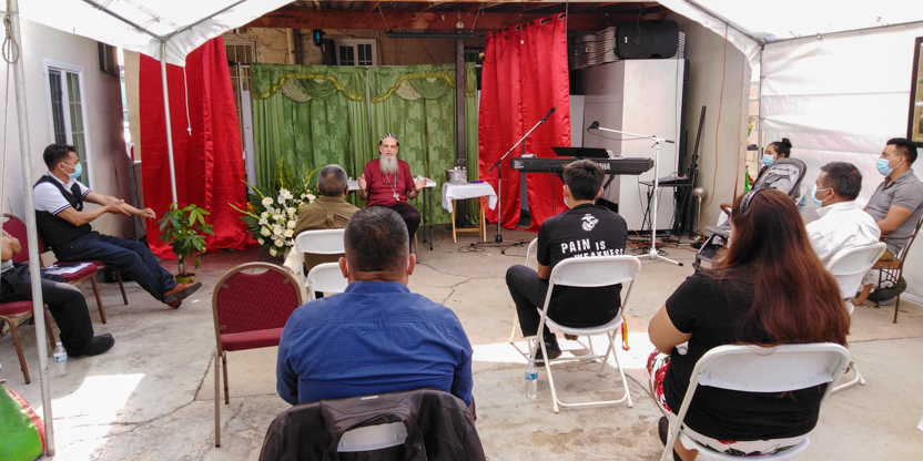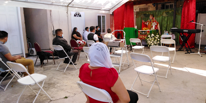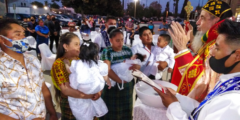 De acuerdo a las normas sanitarias que están en vigencia en el Condado de Los Ángeles, la celebración de la liturgia tuvo lugar en un área abierta, adyacente al templo.