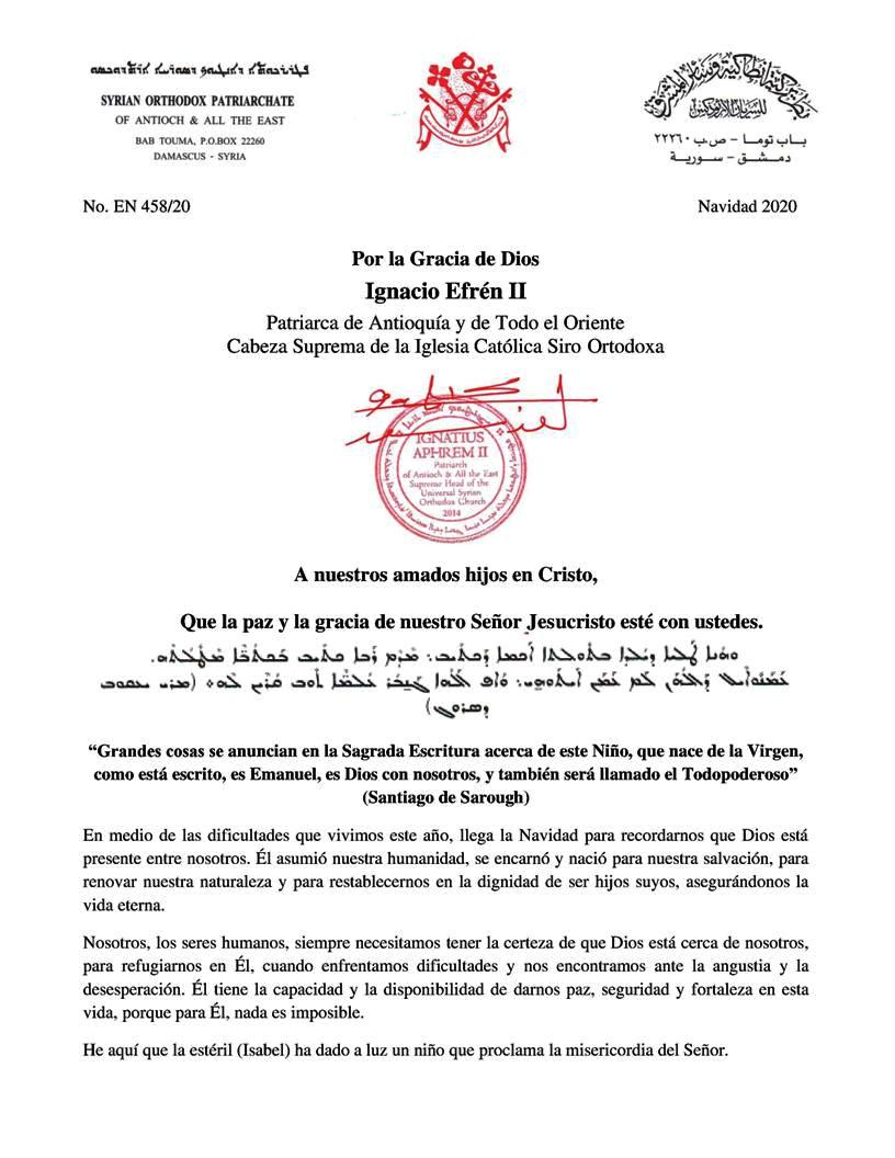 El día de hoy, 24 de diciembre, hemos recibido la Carta-Mensaje de Su Santidad Ignacio Efrén II, Patriarca de Antioquía y de todo el Oriente, con ocasión de la Navidad y del Año Nuevo.