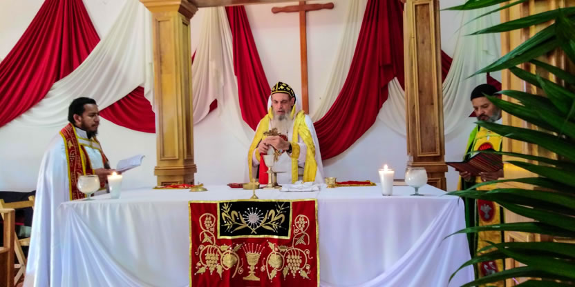 Después. de la bendición del altar y del ambón, el arzobispo presidió la celebración de la divina liturgia en el nuevo templo que han construido los hermanos, en un área contigua a donde se encontraba el primer templo, que era muy pequeño.