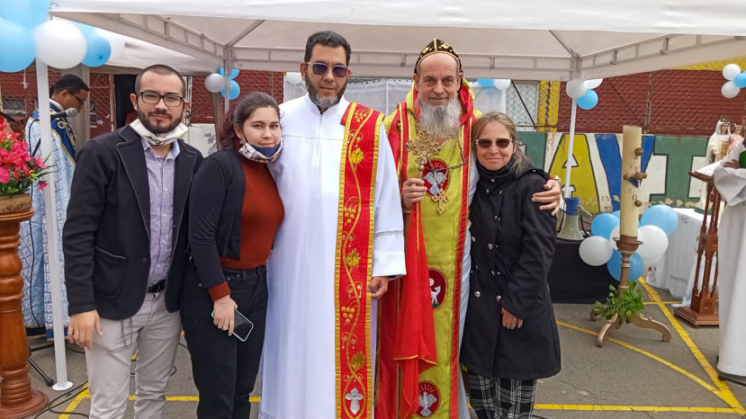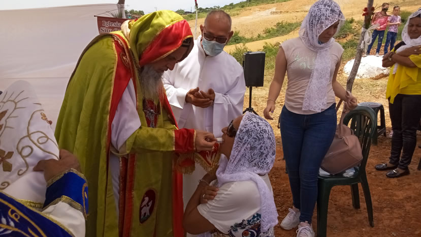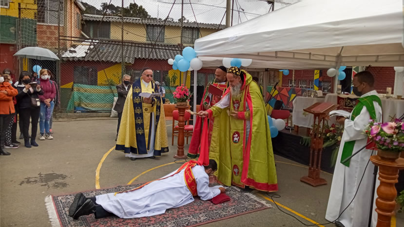 Apenas llegados a la cancha deportiva de la comunidad Bosques de Calderón, inició la celebración de la divina liturgia, presidida por el arzobispo y en la que concelebraron los presbíteros de la vicaría de Colombia.