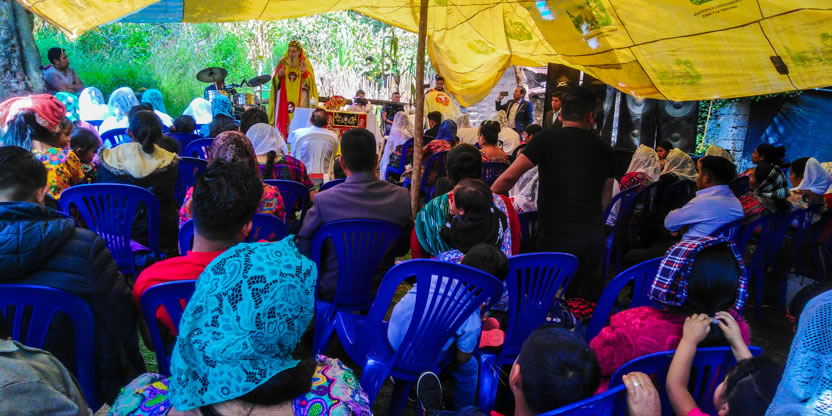 Progresivamente se fue juntando una multitud de hermanos que daban le bienvenida al arzobispo, quien caminó con ellos a lo largo de la aldea, hasta llegar al templo. |