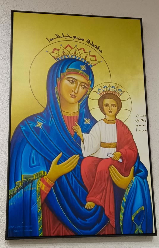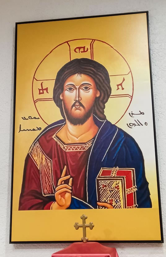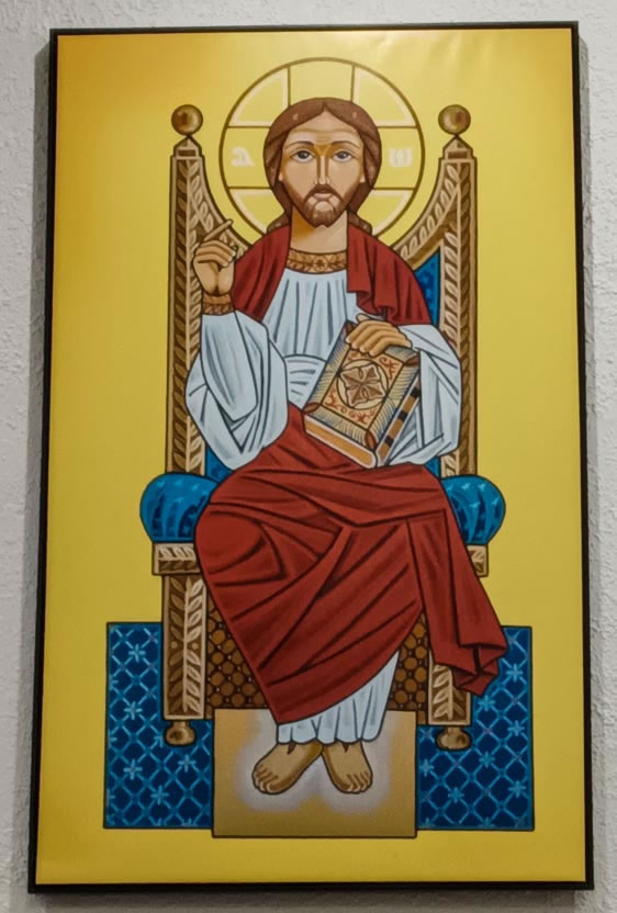 Representando la preparación de la salvación, en la pared primera, se encuentra el icono de San Miguel Arcángel, patrono de la Parroquia y la de la Yoldat Aloho (Madre de Dios), como culminación de toda la preparación y el cumplimiento de las promesas. En la siguiente pared, se encuentran los iconos del Señor resucitado como Señor y Maestro y el del Señor como el todopoderos Rey del Universo. En la pared siguiente, un icono de la última cena, como signo de la actualización continuada de la presencia del Señor en su Iglesia. Finalmente, el la pared frente al altar, el icono de la consumación de la salvación, en donde, en torno al símbolo de la vid, se encuentra el Señor glorioso y los doce apóstoles. |