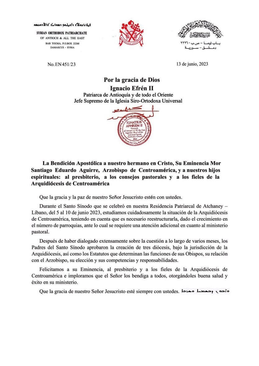 El trece de junio, Su Santidad el Patriarca ha enviado a Mor Santiago Eduardo la Encíclica en la que hace constar la decisión que tomó el Santo Sínodo acerca de la reestructuración de la Arquidiócesis de Centroamérica.