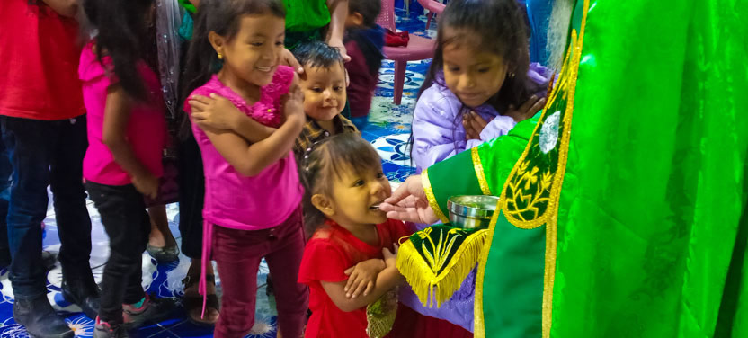 Una característica especial de la comunidad es la participación de numerosos niños, los cuales lo hacen con mucha atención y sincera devoción. |