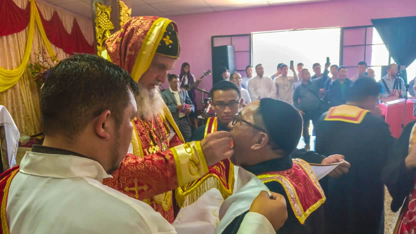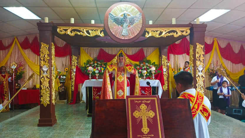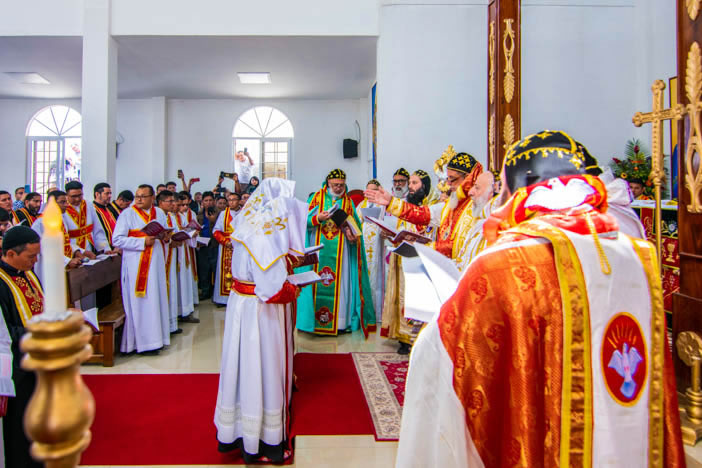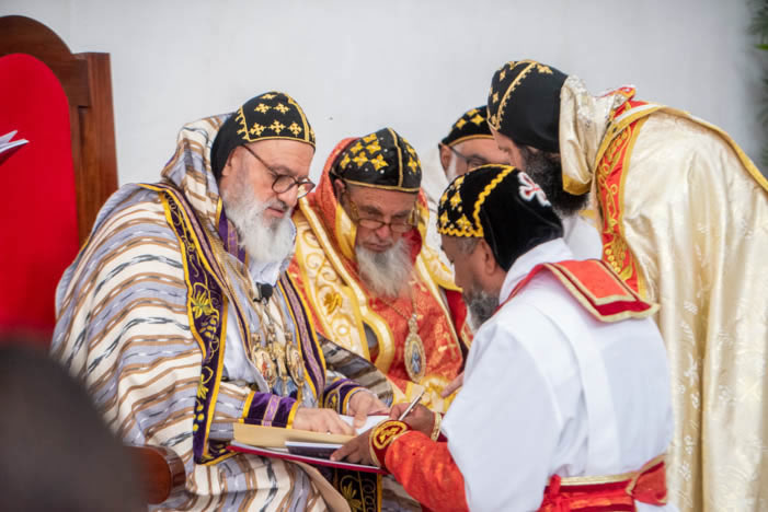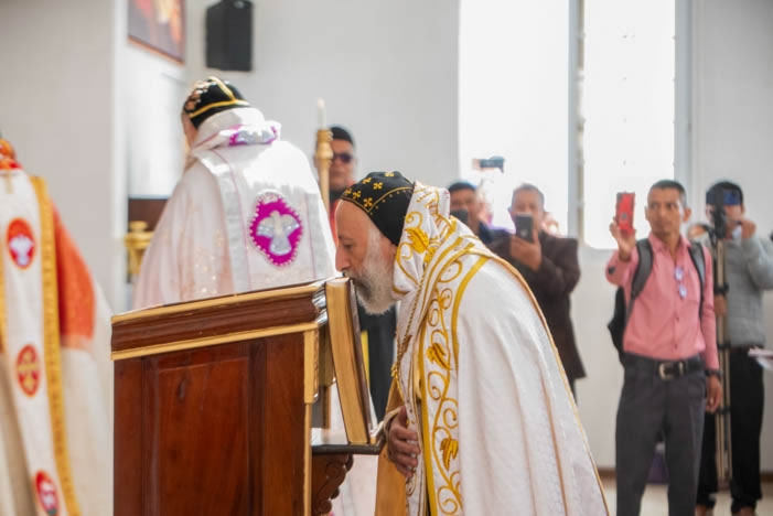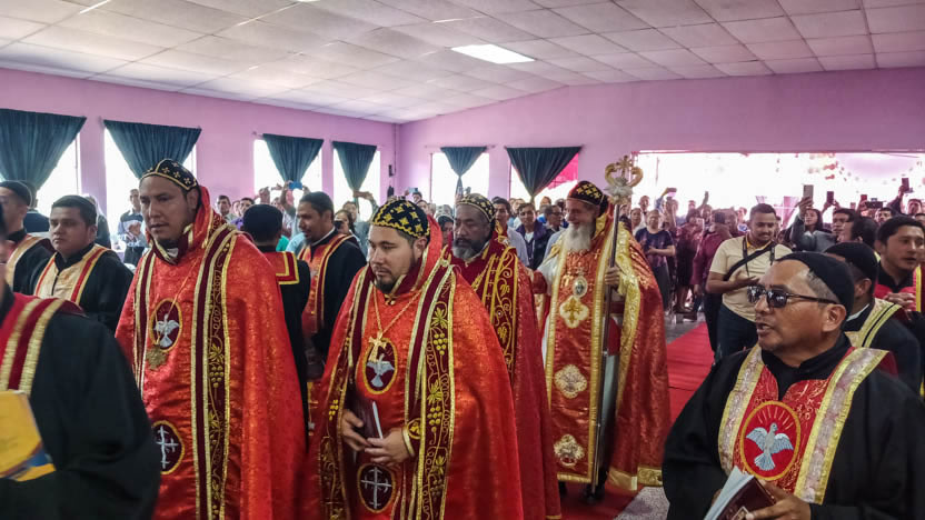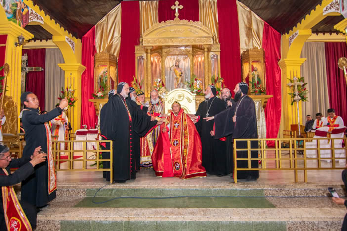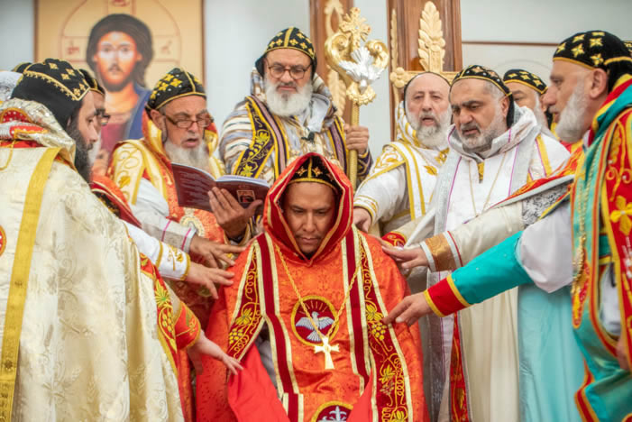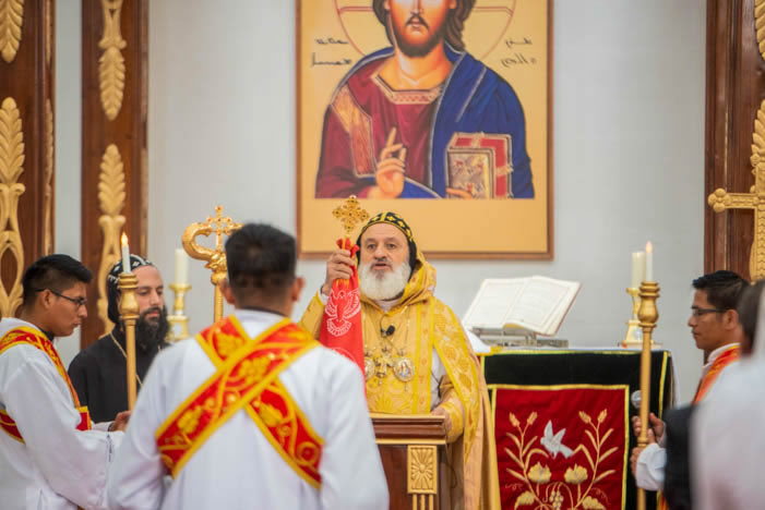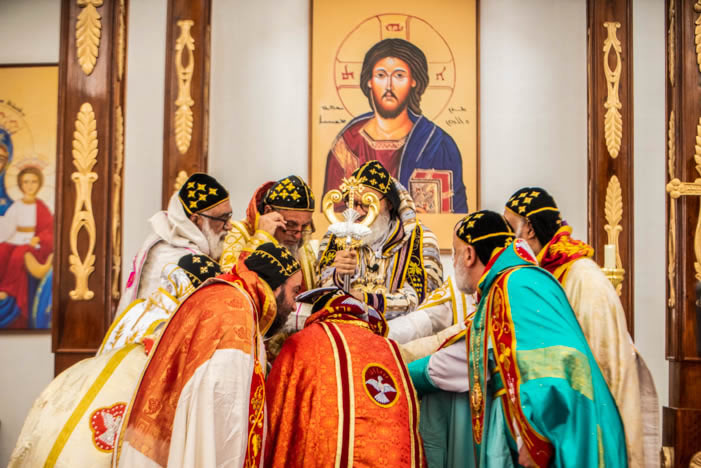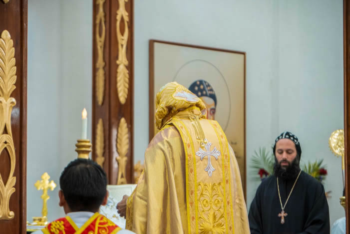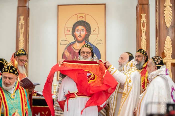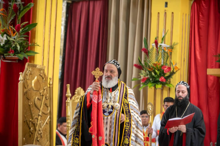 Antes de la comunión con los divinos misterios, como está previsto por el ritual de la Iglesia Siro Ortodoxa, el arzobispo presidió los ritos sacramentales de entronización de Su Gracia Mor Marcos Caicedo, como primer obispo de la diócesis del occidente.