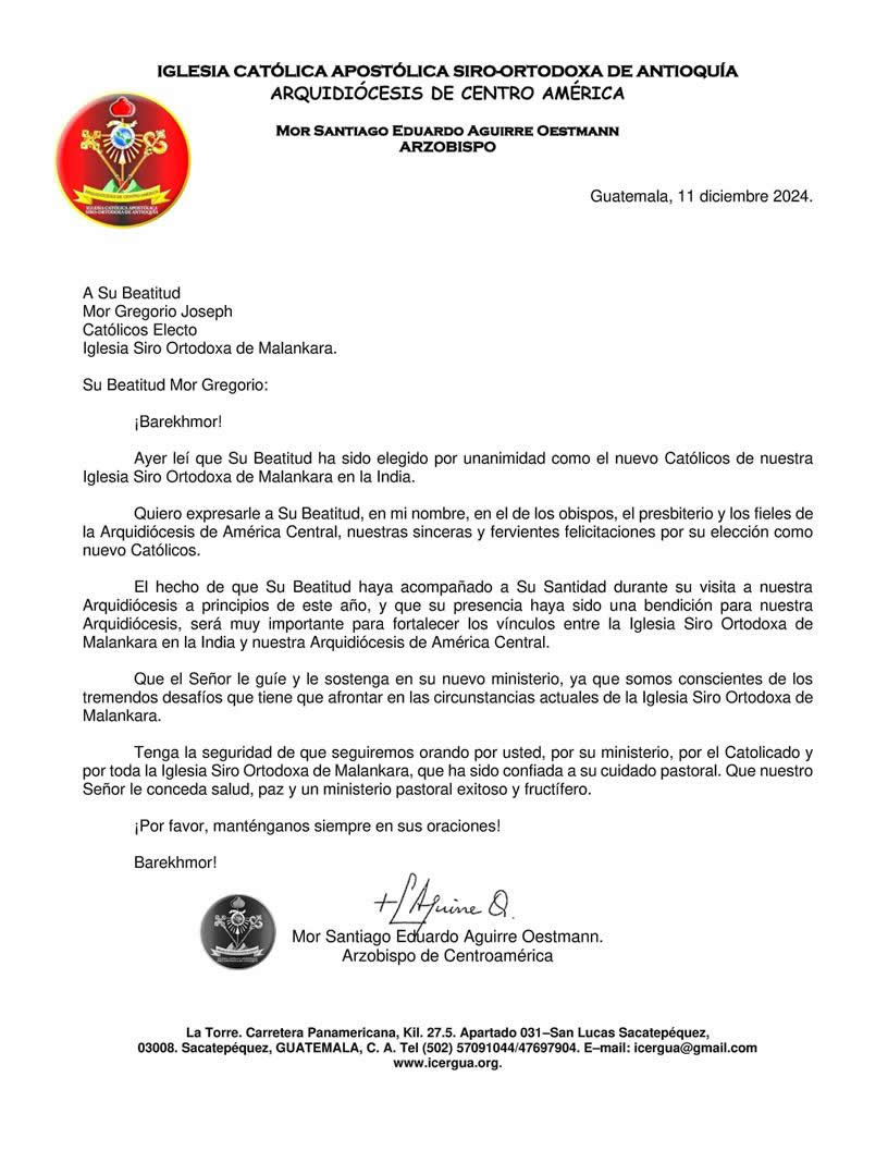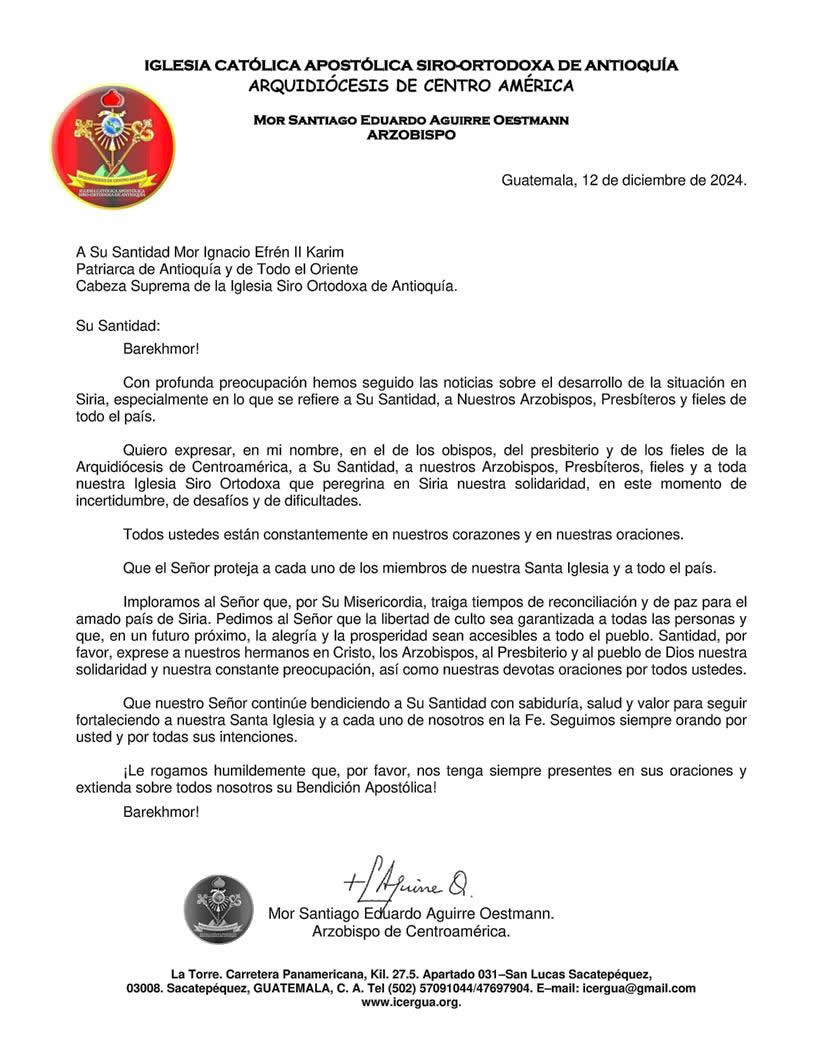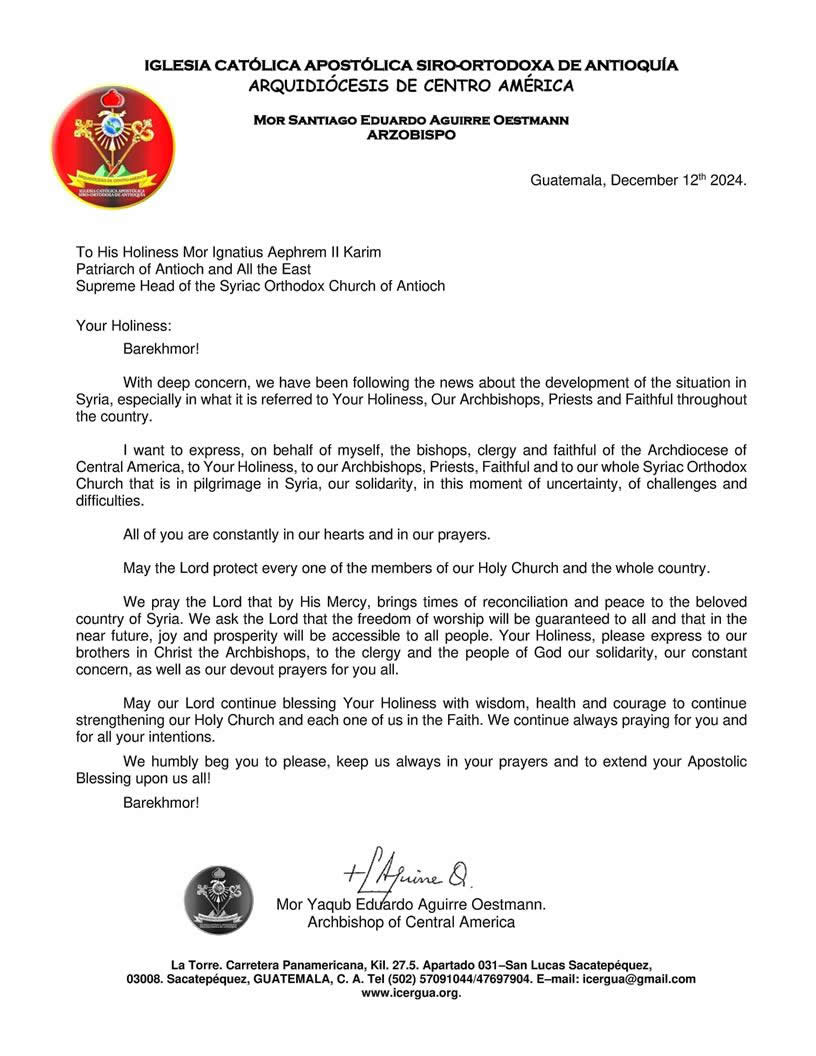 El juves 12 de diciembre, Mor Santiago Eduardo escribió una carta a Su Santidad el Patriarca, Ignacio Efrén II, expresando los sentimientos de preocupación, cercanía y solidaridad, así como de apoyo espiritual de la Arquidiócesis de Centroamérica, a nuestra Santa Iglesia que, presidida por Su Santidad el Patriarca, peregrina en Siria.