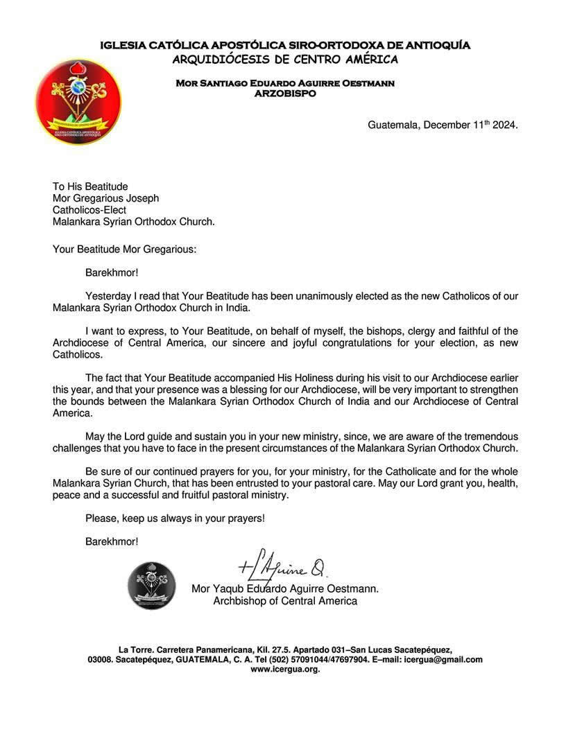 El 11 de diciembre, después de haber recibido la información pertinente, el arzobispo envió saludos a Su Beatitud Mor Gregorio José, por haber sido elegido como Católicos de la Iglesia Siro Ortodoxa en Malankara, India.