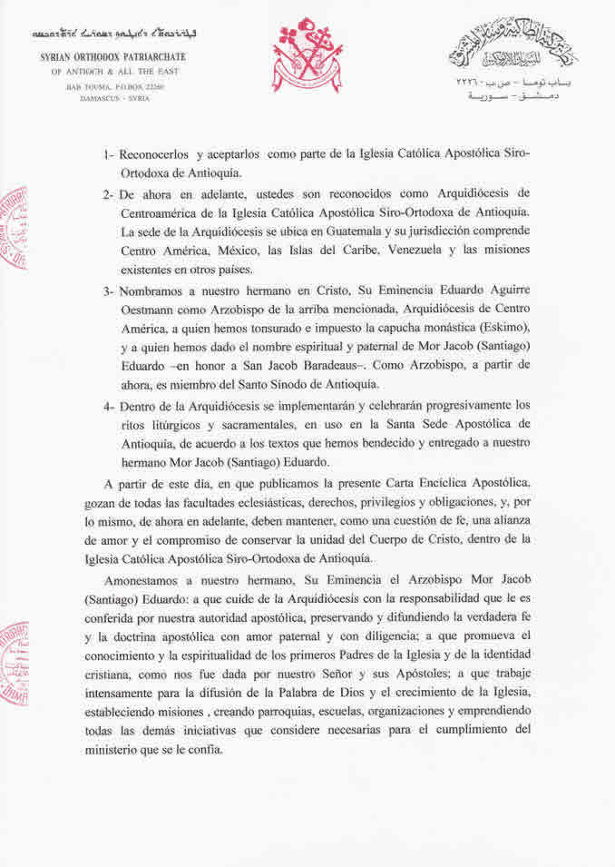 En ese día, después de haber recibido el parecer favorable del Santo Sínodo de Antioquía, Su Santidad Ignacio Zaqueo I Iwas, ordenó como monje y le dio el nombre de Yaqub (Santiago) a Monseñor Eduardo Aguirre Oestmann, se creó la Arquidiócesis de Centroamérica y a Mor Santiago Eduardo Aguirre Oestmann, se le nombró como su primer arzobispo.
